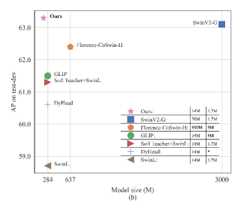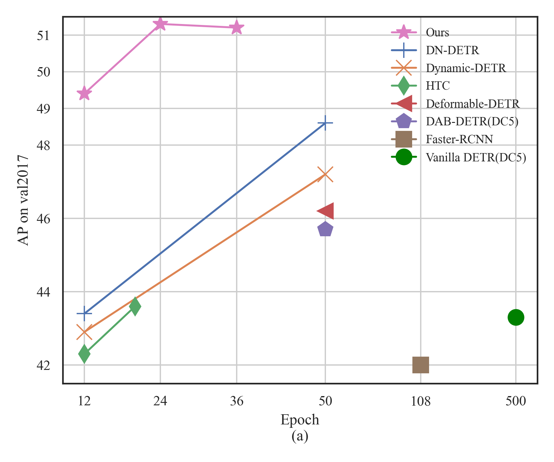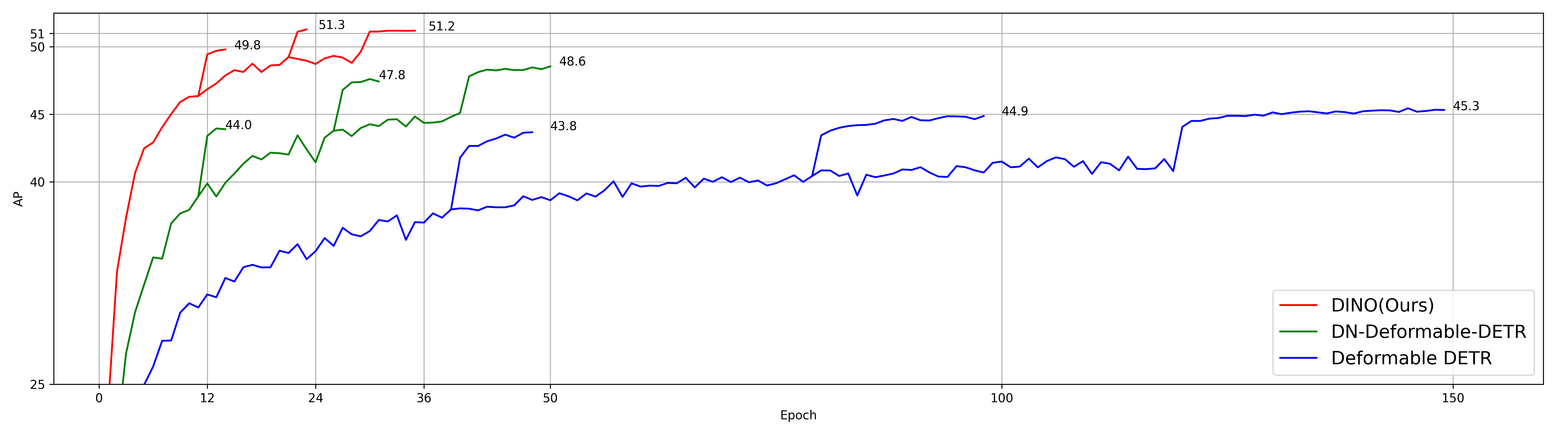 DINO achieves higher AP (Average Precision, true positives / true positives + false positives, higher the better) under less epochs while having a smaller model size, ICLR 2023.