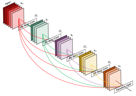 To ensure maximum information flow between layers in the network, we connect all layers (with matching feature-map sizes) directly with each other. To preserve the feed-forward nature, each layer obtains additional inputs from all preceding layers and passes on its own feature-maps to all subsequent layers