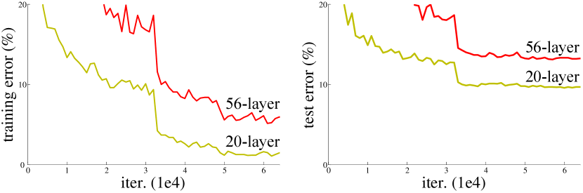 Introduced by He et al. Deep Residual Learning for Image Recognition, CVPR 2016, ResNets were designed to address the issue where deeper network has higher training error, and thus test error (first image in the gallery below). Likely due to the gradient vanishing problem (limit for small floating number stored in each tensor) from back propagation for deeper networks.