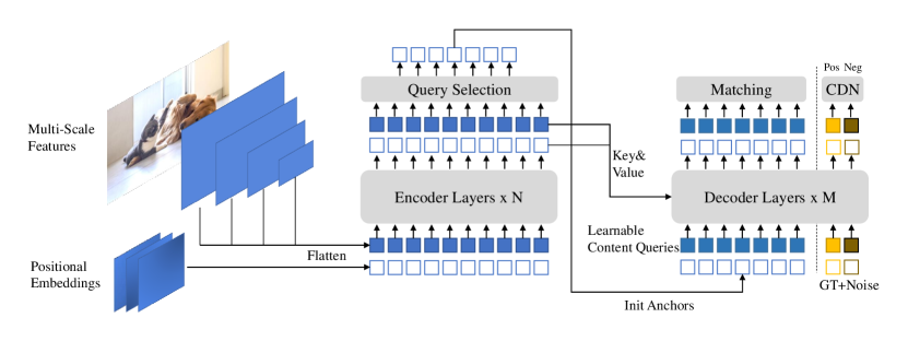 Unlike DETR, which takes the largest feature map for subsequent work, DINO takes feature maps from various scales. A positional embedding is used to help the transformer. Its Contrastive DeNoising (CDN) training section (ground true, GT + noise) is different from DETR, containing group0 and group1