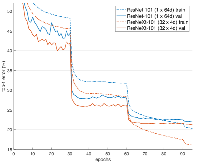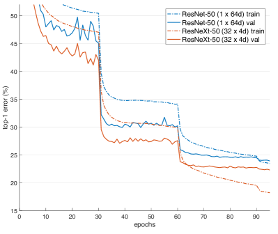 Left: ResNet/ResNeXt-50 with preserved complexity ( ~4.1 billion FLOPs, ~25 million parameters);Right: ResNet/ResNeXt-101 with preserved complexity ( ~7.8 billion FLOPs, ~44 million parameters).