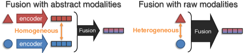 Modality refers to a way in which a natural phenomenon is perceived or expressed. Multimodal has multiple involved modalities. Modalities sits along a spectrum from raw (closer to a sensor) to abstract (further away from sensors, down the data processing pipelines). In a multimodal computational study, each entity is heterogeneous but interconnected.